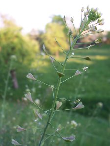 Hirtentäschel ist ein zweijähriges Kraut, es wächst auf Äckern, Ödland und an Wegrändern. Die einzelnen Blätter, die einer Rosette entspringen, ähneln mit den gezackten Rändern dem Löwenzahn. An den etwa 40 cm hohen Stängeln bilden sich gleichzeitig Blütenknospen, weiße Blütchen und dreieckige Kapselfrüchte. Die Pflanze blüht und fruchtet das ganze Jahr hindurch. |