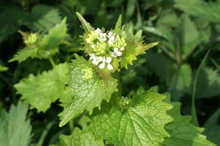 Die Knoblauchsrauke ist eine ein- bis zweijährige Pflanze aus der Familie der Kreuzblütler. Kleine weiße Blüten sitzen auf einem bis zu 100 cm hohen Stängel, die gestielten Blätter sind herz- bis nierenförmig. Nach kurzer Blütezeit erscheinen kleine Schötchen, die für eine starke Versamung verantwortlich sind. Schattige Waldränder, Hecken, nährstoffreiche Böden sind bevorzugte Standorte für das massenhafte Vorkommen. |