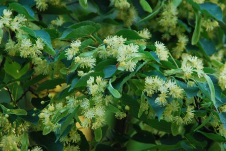 Die Linde ist ein stattlicher Baum, der bis zu 1000 Jahre alt werden kann. Der bis zu 40 m hoch werdende Baum hat eine kugelförmige Krone. Die herzförmigen, leicht gezähnten Blätter haben an der Unterseite kleine Haarbüschel. Diese sind bräunlich bei der Winterlinde, weißlich bei der Sommerlinde. Der duftende gelblich- weiße Blütenstand hat ein zungenförmiges Hochblatt, das zur Teedroge gehört. Blütezeit ist von Juni bis Juli. |